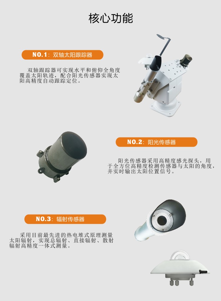 ●一體式測(cè)量太陽(yáng)總輻射,直接輻射,散射輻射等;